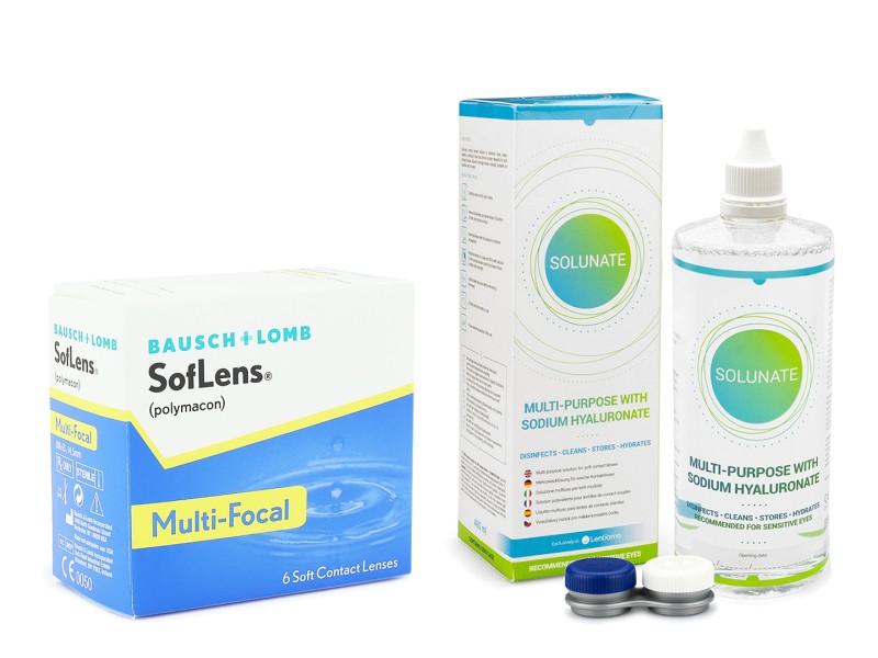 Pachet economic la preț avantajos: lentile de contact sferice lunare SofLens Multi-Focal (6 lentile) și soluția Solunate Multi-Purpose 400 ml.